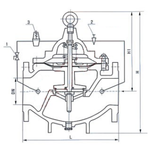 当阀门从进口端给水时,水流过针阀进入主阀控制室,出口压力通过导管作用到导阀上。当出口压力高于导阀弹簧设定值时,导阀关闭。控制室停止排水,此时主阀控制室内压力升高并关闭主阀,出口压力不再升高。 当阀门出口压力降到导阀弹簧设定压力时,导阀开启,控制室向下游排水。由于导阀系统排水量大于针阀的进水量,主阀控制室压力下降。进口压力使主阀开启。在稳定状态下,控制室进水、排水相同,主阀开度不变,出口压力稳定。 调节导阀弹簧即可设定出口压力。
